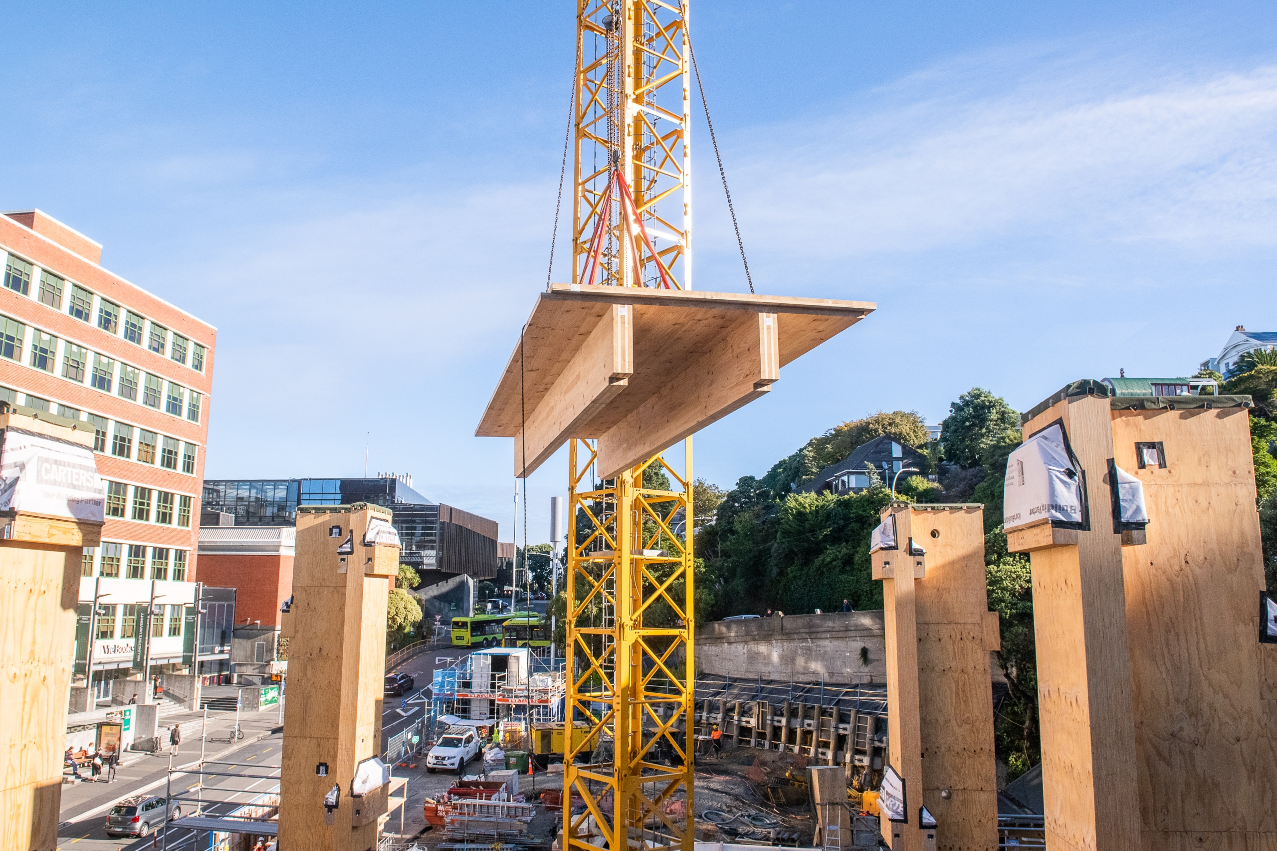 Fabricating LVL panels into beams and columns requires specialist techniques that Red Stag TimberLab has incorporated into its expertise. Slabs of LVL are glued together to form large wall panels, beams and columns up to 1200mm deep and almost any width and length. The results are strong energy-absorbing structures especially suited to provide seismic resistance using post tension frame systems or large shear walls.
